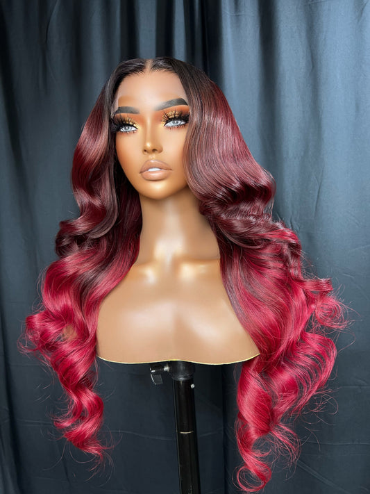 “RISSA” 5x5 LACE CLOSURE, 26-INCH BURGUNDY OMBRÉ RED WIG, BEAUTIFUL BODY WAVE HUMAN HAIR, GLUE-LESS READY TO WEAR WIG