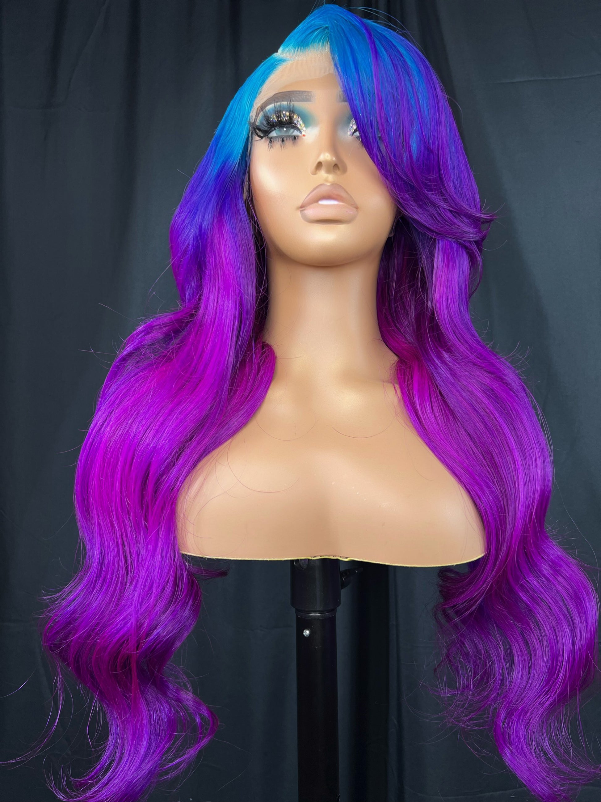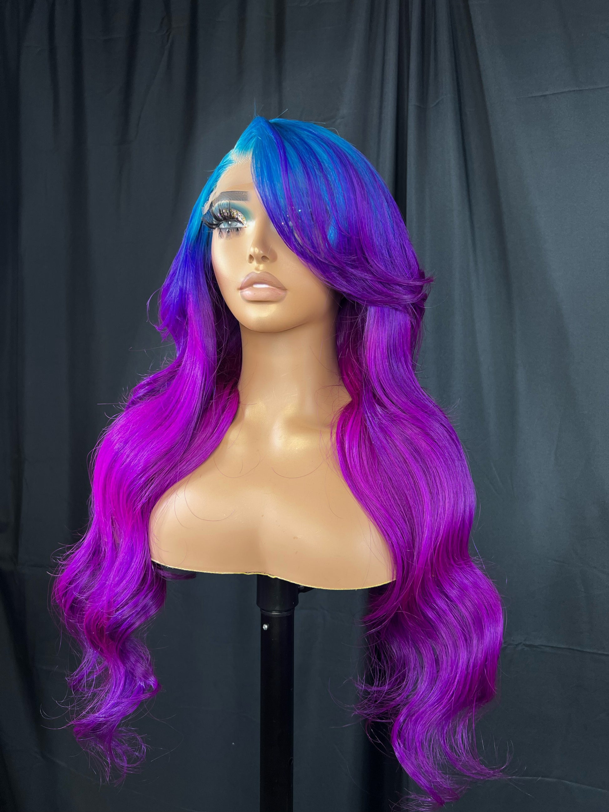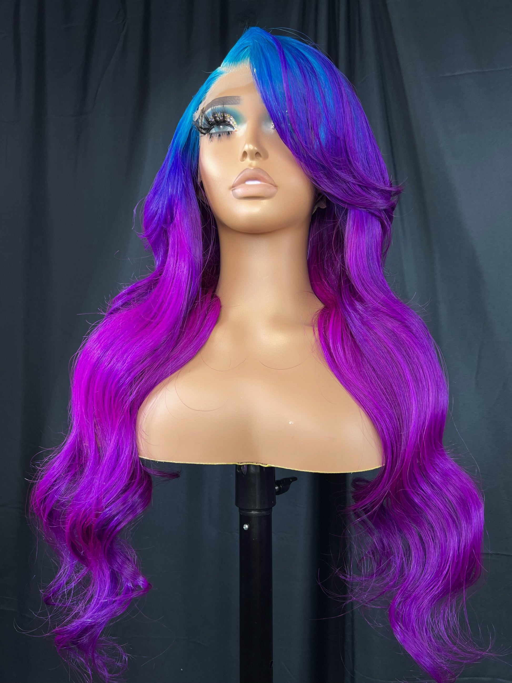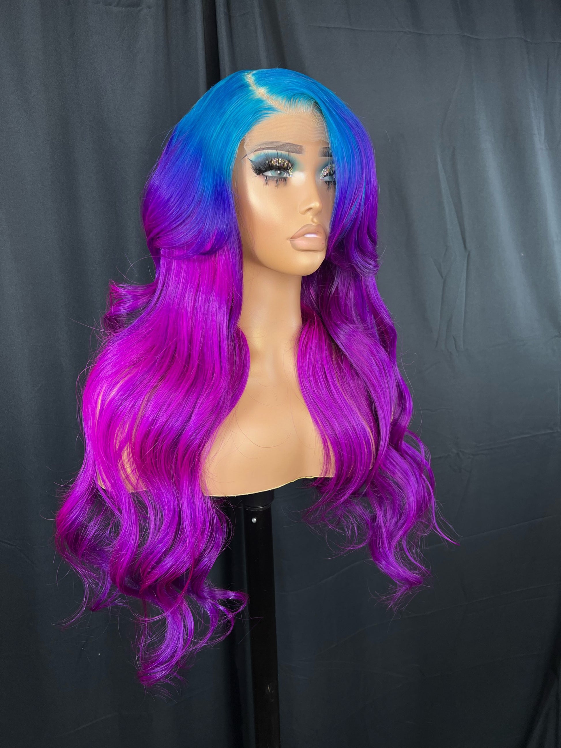 5x5 Transparent Lace Closure Wig, Custom Color: blue & purple ombre, 24 inches, Body Wave Texture, Medium Cap (fit 22-23), 180 density, Glue-less option